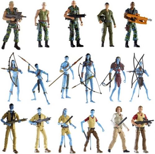 On retrouve certains personnages des Na’vi qui ont la caractéristique d’être phosphorescente comme Tsu’Tey, Eytukan, Jake Sully et Neytiri. L’éditeur propose également les personnages humains comme Jake Sully en fauteuil roulant, Colonel Miles Quaritch, Trudy Chacon, Norm Spellman, Corporal Lyle Wainfleet et Sean Fike. Chaque figurine est livrée avec son arme du film : pour les aliens des arcs, pour les humains des fusils d’assaut, à l’exception du pilote Trudy Chacon livré avec un casque de pilote.